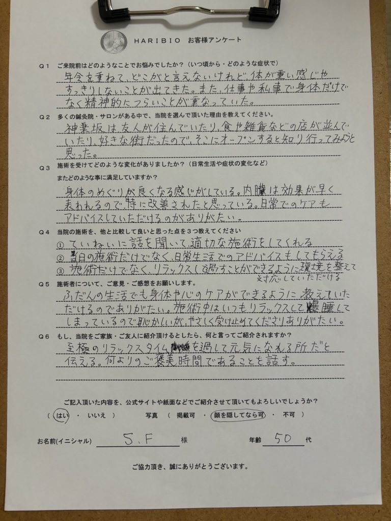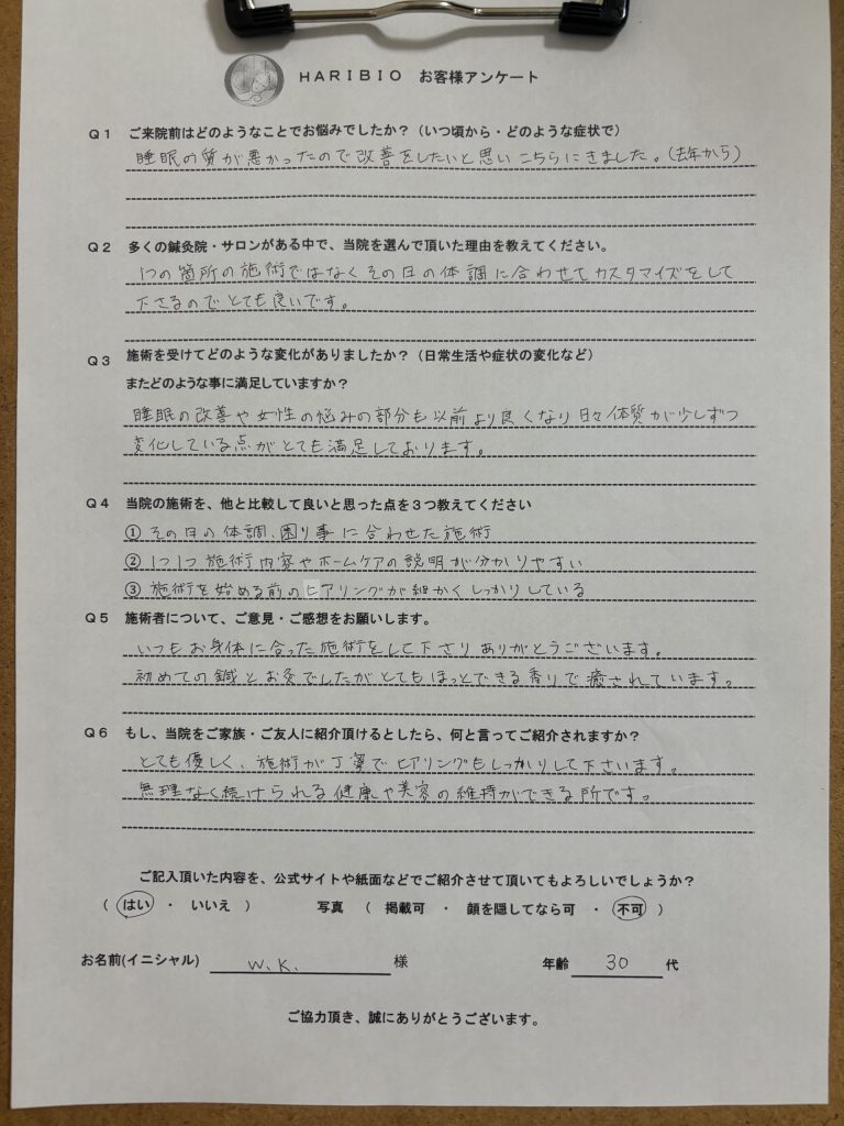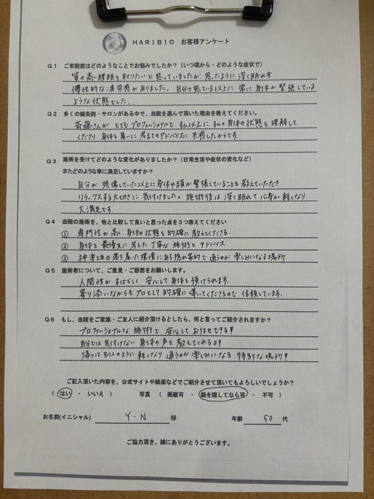 そのような体験から、快眠と美容を両方叶える仕事がしたいと思い、不妊専門の鍼灸院を辞め、整骨院・ホテル・睡眠専門の鍼灸院で経験を積みました。その中で、はり×お灸×エステ×ヘッドマッサージ×ストレッチを融合した施術を編み出し、効果が出る事を確信しました。そして、2025年8月神楽坂に『はり・きゅうHARIBIO(ハリビオ)』を開業致しました。