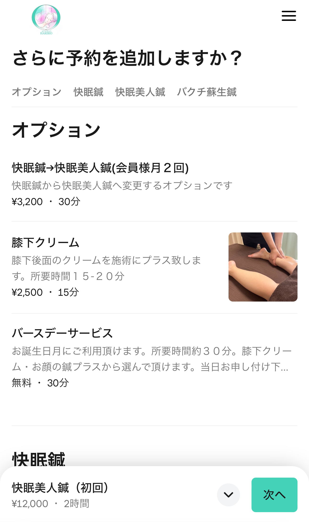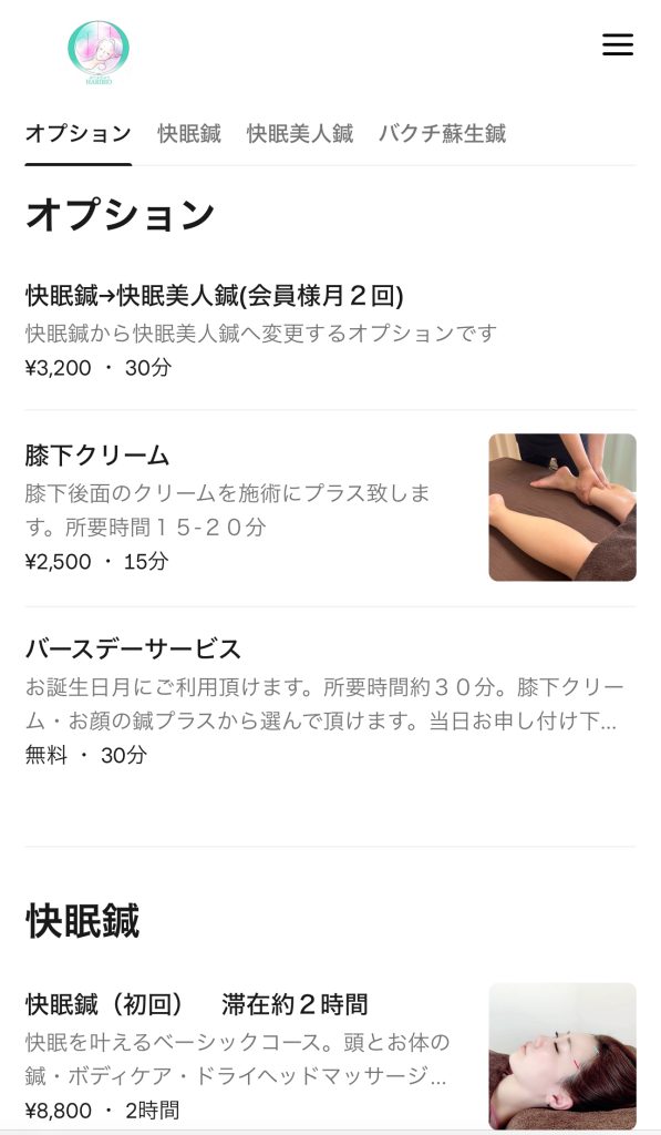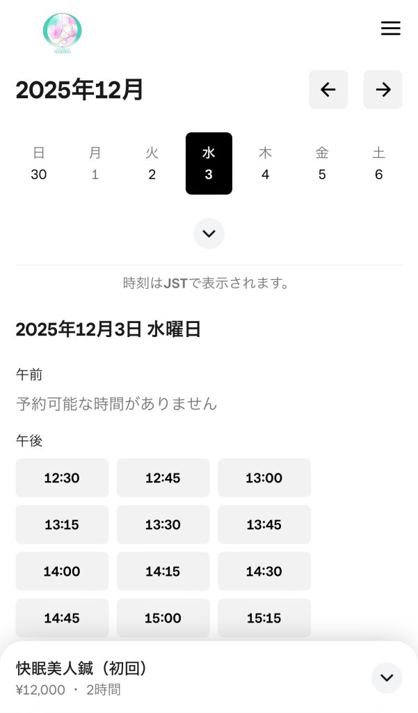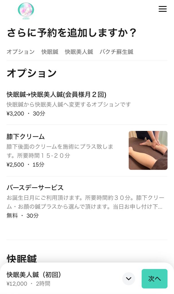 予約 予約 ① LINEで友だち登録して割引クーポンをゲット!LINE友だち追加↓割引クーポンを受け取る ② 24時間いつでもご予約可能ですWEB予約はこちら 予約方法 ① ご希望のメニューを選択して下さい 初回の方は、初回メニューを、会員の方は、ご自身のプランをご選択下さい ② 「追加」ボタンを押してください ③ オプション オプションをご希望の方は、オプションを選択し、「次へ」を押します ④ ご希望の日時をご選択下さい 日時を選択すると画面が変わります ⑤ 「予約する」ボタンを押して下さい